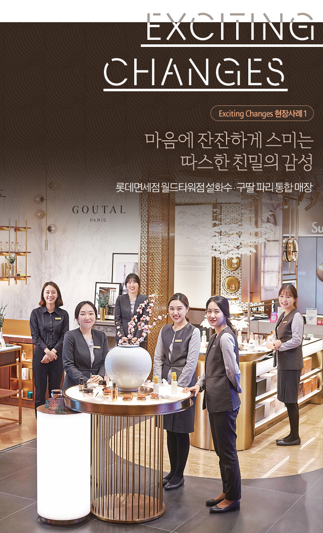 "롯데면세점 월드타워점의 매출이 높은 이유도 있지만, 무엇보다 내국인 고객 방문 비율이 높기 때문이에요. 일반적으로 외국인 고객들은 단체로 여행 와서 필요한 제품을 구매해 바로 매장을 나서지만, 내국인 고객들은 백화점에서처럼 제품을 충분히 경험하는 딥 카운셀링을 요구하거든요. 기존의 설화수 단독 매장은 아일랜드형으로 구성돼 있어서 한 사람 한 사람에게 깊이 있게 다가가는 딥 카운셀링이 어려웠는데, 듀얼 부티크 매장에서는 편하게 앉아서 피부 측정도 하고 제품도 하나하나 경험해볼 수 있어 고객들이 더 만족스러워하고 있어요."