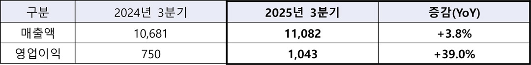 - 매출 1조 1,082억 원(+3.8%), 영업이익 1,043억 원(+39%) 달성