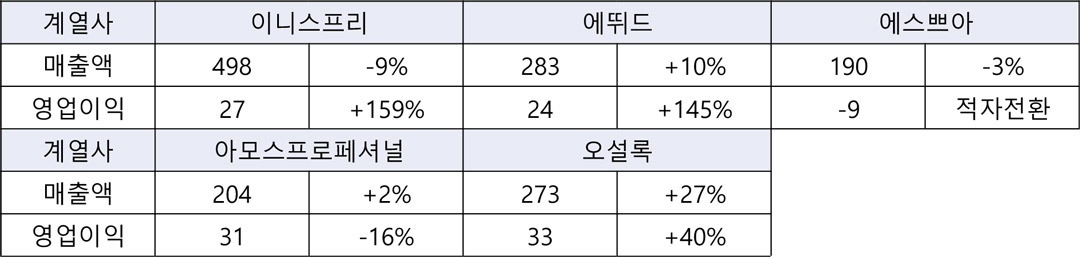 [주력 계열사 아모레퍼시픽 연결 실적] (단위: 억 원/전년 동기 대비 성장률)