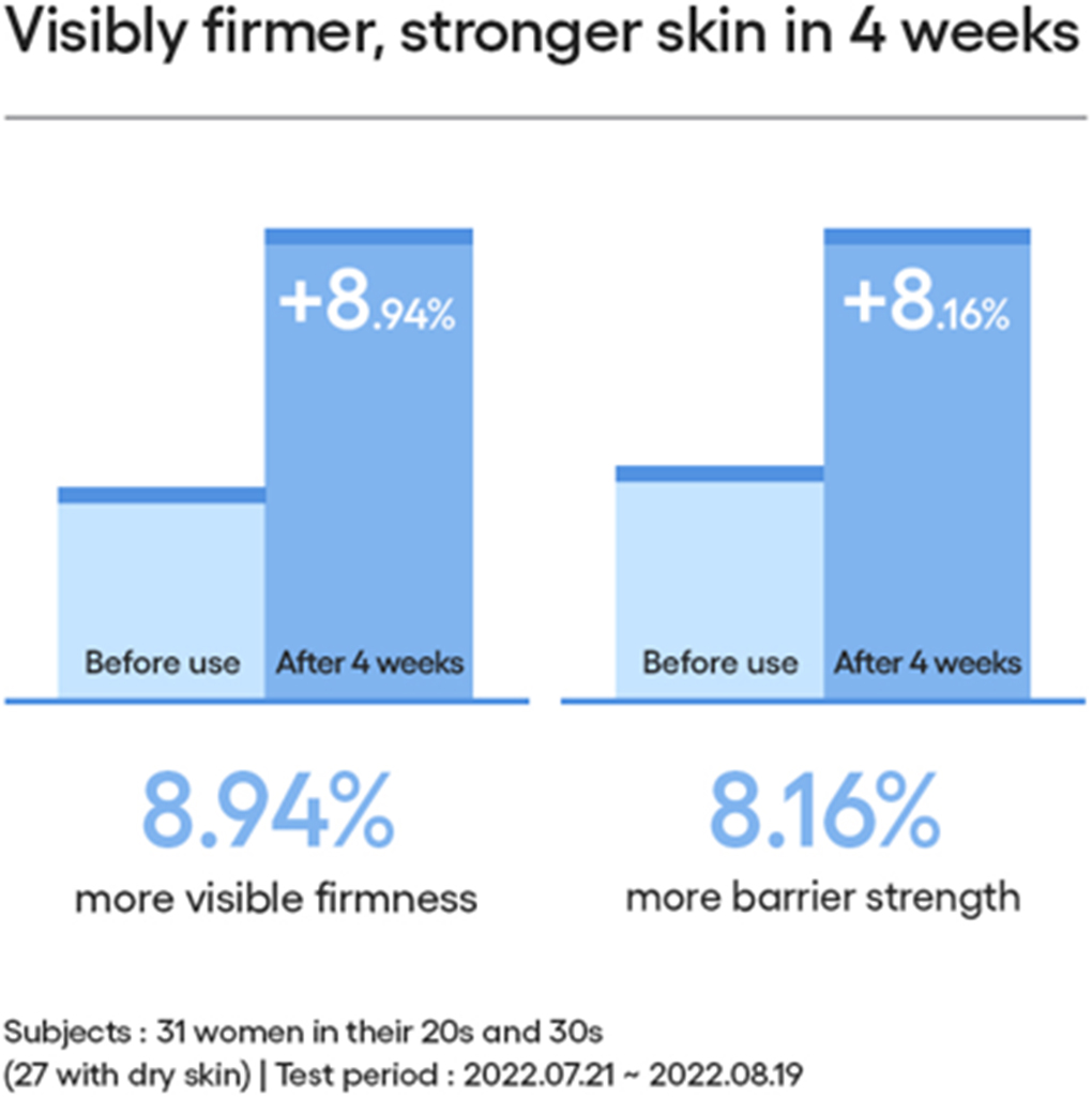4주간 크림 스킨을 사용한 결과, 피부 탄력은 8.94% 증가하고 피부 장벽은 8.16% 강화되는 것을 확인했다.