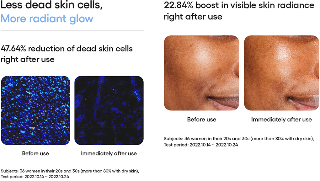 크림 스킨 사용 직후, 각질은 47.64% 감소 피부 광채는 22.84% 증가했다.