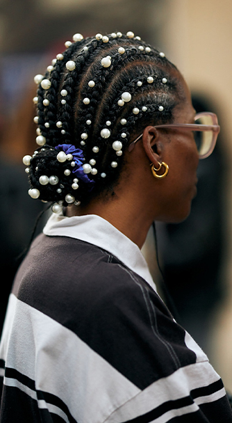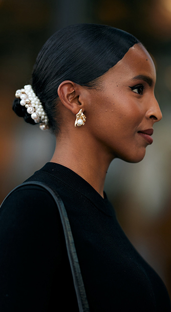 검은 머리에 화이트 진주나 컬러풀한 헤어 액세서리를 더하면 데일리 룩에서도 우아함과 개성을 자연스럽게 살릴 수 있다.