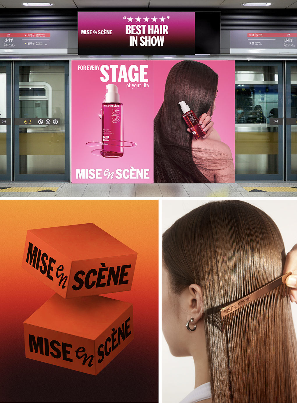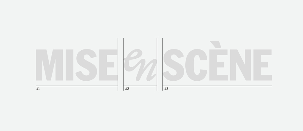 미쟝센이라는 이름은 프랑스어 ‘mise-en-scène’, 영화에서 장면을 연출한다는 뜻에서 왔습니다. ‘스타일링은 곧 자기 연출’이라는 미쟝센의 메시지를 BI에 녹여 전달하기 위해, 브랜드명은 하나의 장면처럼 구성된 시네마틱 구조로 재해석되었습니다. ‘MISE’, ‘en’, ‘SCÈNE’ 세 단어는 각기 다른 굵기, 크기, 서체 스타일로 구성되어 시선을 따라 자연스럽게 읽히도록 설계되었으며, 가운데 위치한 ‘en’은 머리카락의 흐름을 연상시키는 곡선 형태로 표현되어 헤어 브랜드 고유의 유연함과 리듬감을 시각적으로 드러냅니다. 이러한 비대칭적 구성은 시선을 마지막 단어인 ‘SCÈNE’으로 자연스럽게 이끌며, 직관적으로 브랜드명을 ‘scene’이라는 영어 단어로 연결 짓게 합니다. 결과적으로, ‘mise-en-scène’이라는 브랜드명은 단순한 텍스트를 넘어, 브랜드의 철학과 세계관을 담은 하나의 장면처럼 인식되도록 작동합니다.