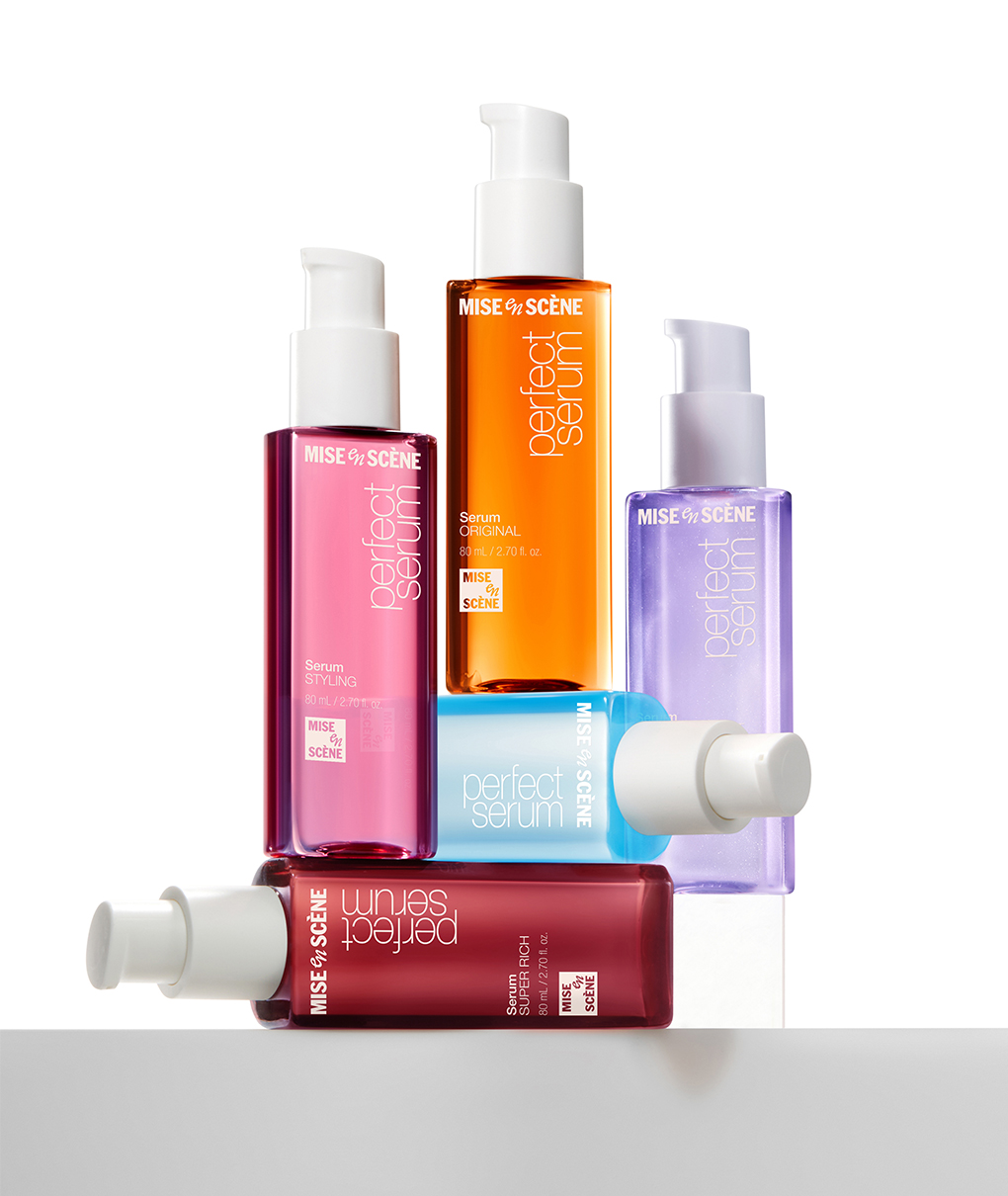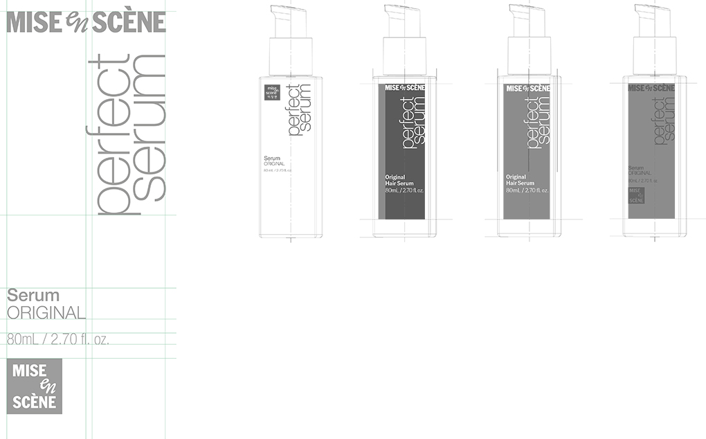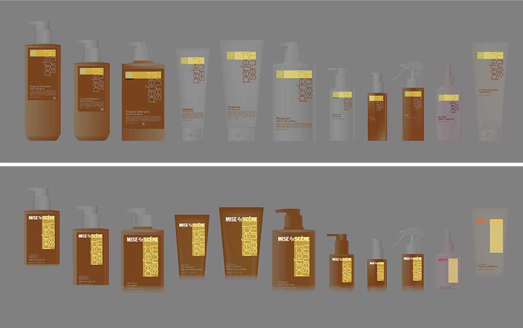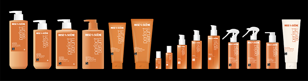 새로운 BI 시스템이 처음 적용된 대상은 미쟝센을 대표하는 스테디셀러, 퍼펙트세럼입니다. 헤어세럼을 중심으로 워시오프, 리브온 타입의 세정제, 양모제 등 총 75종의 제품군으로 구성된 이 라인은 3ml 샘플 파우치부터 990ml 대용량까지 다양한 용기와 금형 구조를 아우릅니다.