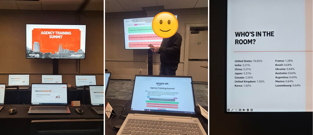 이 세션 참석자 중 단 1.92%만이 한국인이었습니다. 참석 정원 수를 고려하면 10명이 채 되지 않는 숫자. ‘아마존 광고’라는 공통 관심사 하나로 세계 각국의 사람들이 모인 자리에서 1.92%의 한국인 중 하나였는 알 수 없는 뿌듯함. 그리고 98.08%의 다양한 나라의 사람들과 같은 주제에 대해 공부하고 경쟁했다는 짜릿함. 그 두 감정으로 가득 찬 첫날이었습니다.