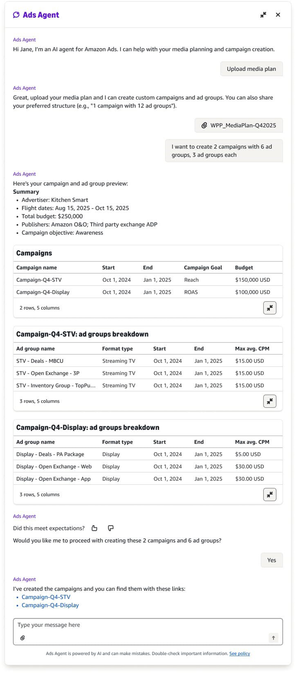 다음은 ‘Ads Agent’입니다. AI 기반 광고 보조 도구로, 광고 캠페인 기획, 실행, 최적화부터 분석까지 모든 작업을 자동화하고 간소화해주는 기능입니다. 광고주가 Media Plan을 업로드하거나 제품에 대한 설명을 하면, ‘Ads Agent’는 그것을 기반으로 어떤 광고 캠페인이 필요한지 구조를 짜주고, 각 캠페인별 타깃, 예산 등을 수립하여 자동으로 캠페인을 생성합니다. 생성이 된 이후에도 광고주의 명령을 기반으로 특정 ROAS(Return On Ad Spend) 이하의 타깃을 끄거나 고효율 키워드에 예산을 더 투자하는 등의 액션을 취합니다. 더불어, 캠페인에 적합한 신규 타깃을 지속적으로 추천해 줍니다. 또한 처음 설명한 AMC 기능이 결합되어, ‘Ads Agent’에게도 복잡한 분석과 생성이 필요한 Audience를 명령어로 넣으면 자동으로 생성해 주어 복잡한 쿼리 작성 시간을 크게 줄여줍니다. 제품 런칭 후 그에 맞는 광고 캠페인 계획을 수립하고 생성하는 데에 시간이 많이 들고, 광고 분석을 위해 데이터를 가공하는 데에도 공수가 많이 들었는데, ‘Ads Agent’가 저와 같은 광고주들의 손발을 제대로 대체해 줄 수 있을지 기대가 됩니다.
