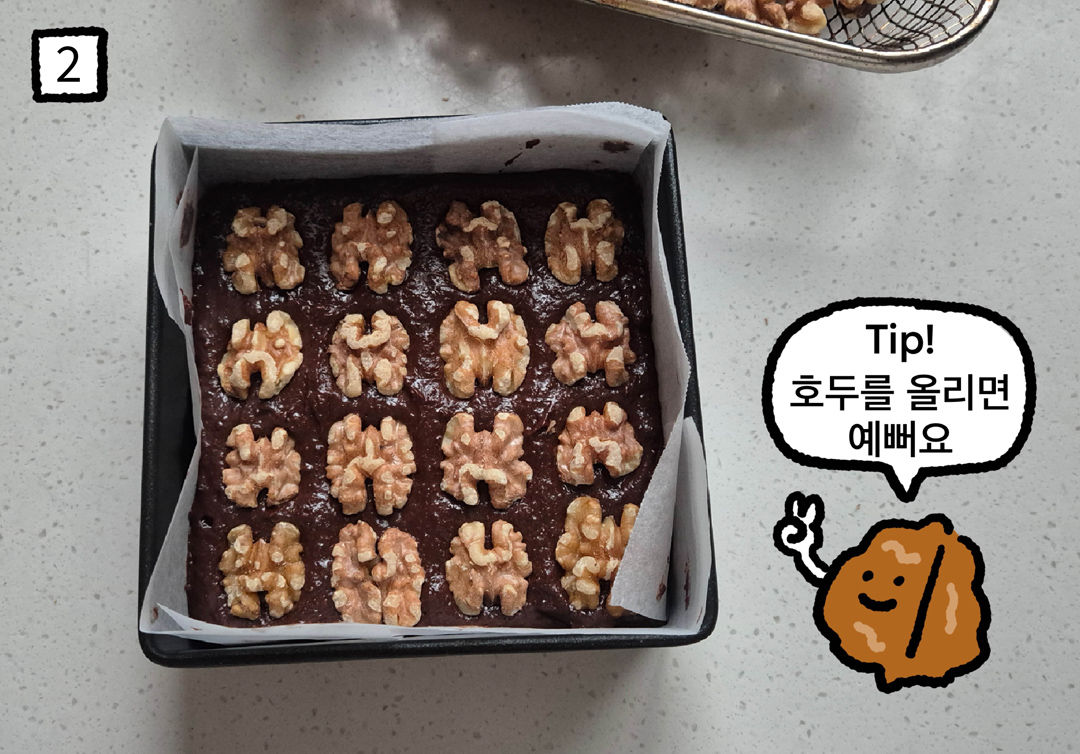 (3) 에어프라이어에서 140 ℃로 14분 돌려주세요. (각자의 기계 사양에 맞춰서 온도를 조절해 주세요. 중간 부분을 젓가락으로 찔렀을 때 묻어 나오지 않으면 완성입니다.) *위에 호두를 올려주면 고소함이 배가 됩니다. (4) 구운 브라우니를 한 김 식힌 후, 반듯하게 자르면 완성입니다!