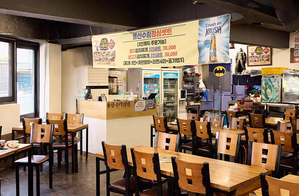 아들 수림식당이었는데, 검색하면 같은 상호명이 많아서 앞에 ‘용산’을 붙였습니다. 용산 토박이고 용산에서 장사한 지 30년 되었으니 붙여도 되겠다 싶어서요.