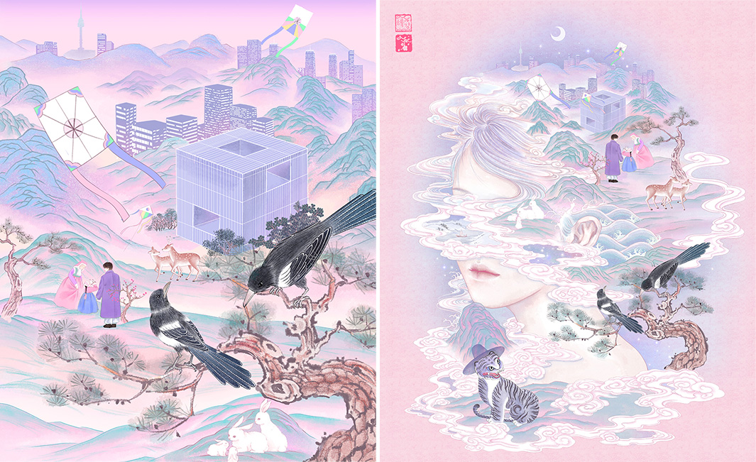 이번 작품에서는 ‘시간의 흐름 속에서도 변하지 않는 가치와 아름다움’ 을 주제로 작업했습니다. 시간이라는 추상적인 개념을 시각적으로 풀어내기 위해 머리카락의 유연한 흐름에 주목했고, 이를 매개로 과거와 현재의 풍경이 자연스럽게 이어지도록 구성했어요. 설날을 맞아 연과 까치, 산과 소나무 같은 상징적인 요소들을 더해 명절 특유의 분위기와 정서를 표현했고, 본사를 중심으로 사람들이 함께 모여 있는 모습에는 ‘함께 시간을 보내는 날’로서의 설날의 의미를 담고자 했습니다.