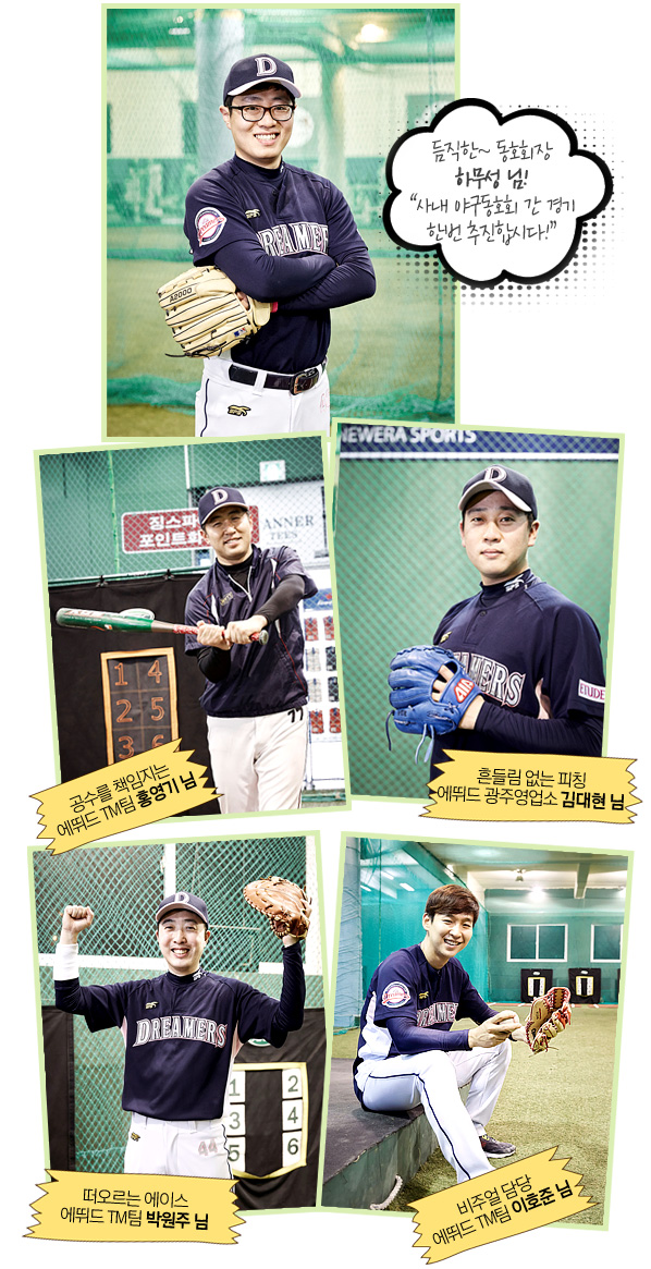 이후 사회인 야구동호회를 취미로 활동하고 있는 몇몇 직원들이 동호회 결성을 건의했고, 회사에서도 적극적으로 지원해 에뛰드 '드리머즈'가 만들어졌습니다. 동호회명도 사내 공모를 통해 결정되었습니다. 영업2팀 노우재 님은 "'에뛰드 드리머즈'는 생각이 정체되어 있는 것이 아니라 자유롭게 생각하고, 열려있는 사고를 가지고 있는 사람들의 모임을 뜻한다"며 "에뛰드가 나아가는 방향도 이와 같다고 생각이 들어 이름을 붙이게 되었다"고 설명을 덧붙입니다.
