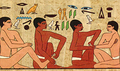 이집트 인의 눈화장을 보여주는 부조 / 이집트 화장용 손거울 / 눈화장 용 먹을 보관하는 단지