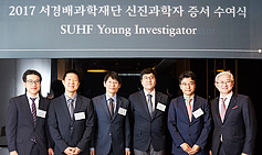 ▲ (왼쪽부터) 서울대학교 교수 강찬희, 매사추세츠대 의대 교수 김도훈, 포스텍 생명과학과 교수 최규하, 울산과학기술원 생명과학부 교수 임정훈, 카이스트 의과학대학원 교수 이정호, 서경배 님 서경배과학재단은 생명