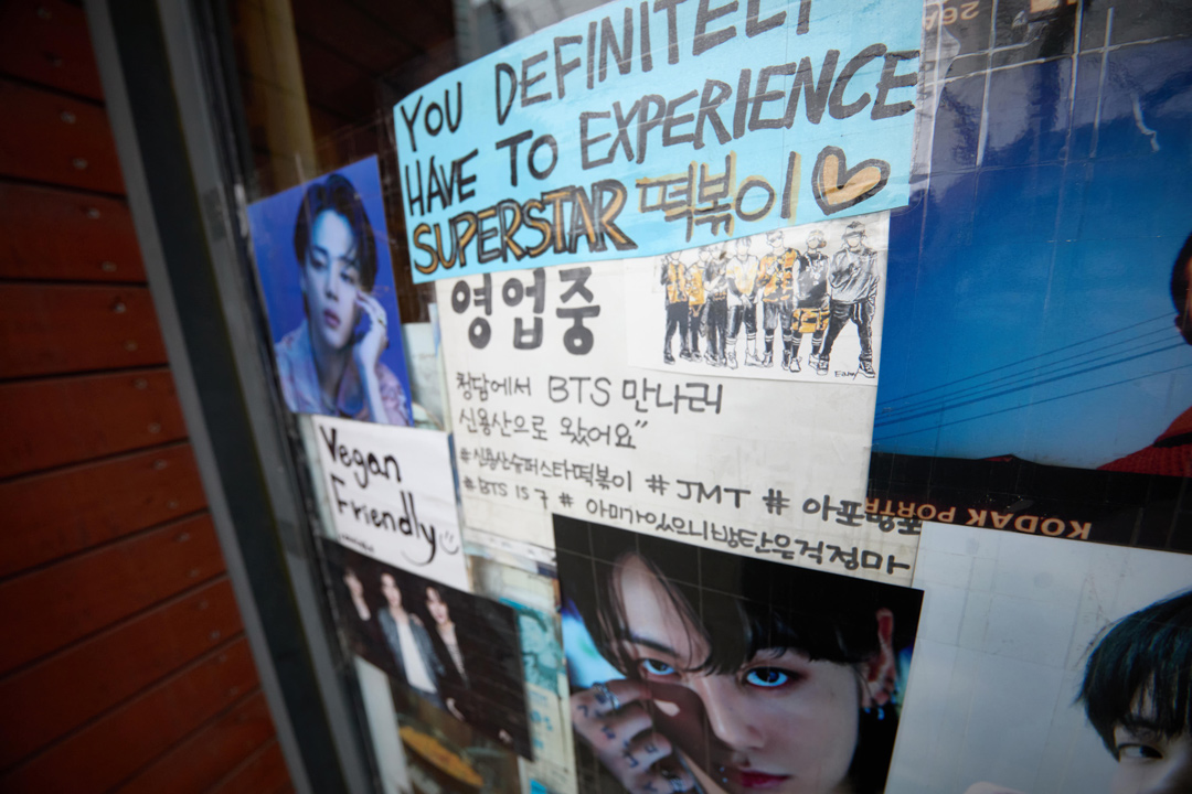 Just in front of the Hangang-daero pedestrian overpass, Superstar Tteokbokki, with its cheerful orange sign, has become the go-to hangout for ARMY — BTS’s global fanbase — from around the world. Powerful speakers fill the space with BTS music, while high-definition screens play an unbroken stream of music videos and BTS content on YouTube. Every wall is covered in BTS posters, photos, and photo cards. Yujin Na and Yujung Choi, the owners of Superstar Tteokbokki, are BTS fans themselves, but they’ll be the first to tell you that none of this was part of the original plan. Not long after they opened on Hangang-daero, where AMOREPACIFIC is headquartered, HYBE moved into the neighborhood, and from that point on, fans of superstars naturally found their way to Superstar Tteokbokki. Today, as always, guests from all corners of the world gather around bubbling pots of tteokbokki, sharing a good time together. For K-pop fans around the world, Superstar Tteokbokki is fast becoming their ultimate soul food.