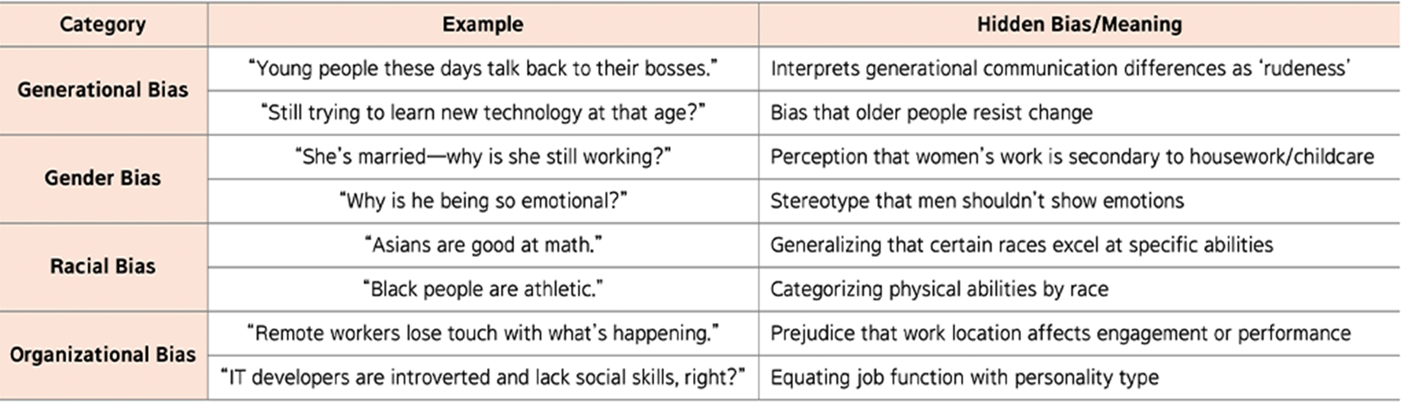 Hearing this made me realize that even our casual remarks can carry bias. Just as I’ve experienced not being respected, I might unintentionally limit or judge someone else. Unconscious bias isn’t some distant issue—it’s constantly at work in our daily lives, organizations, and relationships. I asked ChatGPT for examples of different types of biased statements.