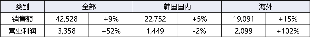 - 销售额增加8.5%至4兆6,232亿韩元,营业利润增加47.6%至3,680亿韩元