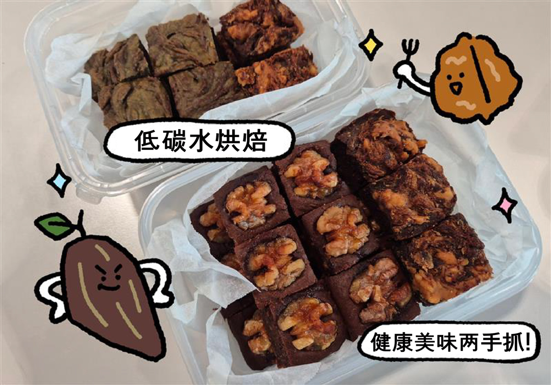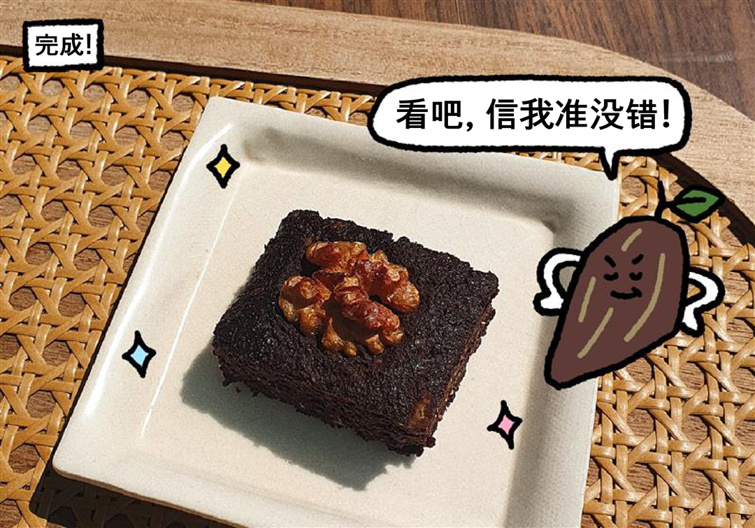 牢记低碳水烘焙的核心三原则后,就可以撸起袖子进入实操阶段了。我推荐给初学者的练手糕点,毫无疑问是布朗尼。鉴于我这个推荐者本人是个不折不扣的巧克力狂,这其中不乏有我的私心在,但更重要的是,制作布朗尼的主料——可可粉自带“失误滤镜”,能够完美掩盖新手操作过程中的各种小瑕疵。对比它的操作难度,成品堪称惊艳:趁热吃像流心熔岩巧克力,冷藏吃像浓郁生巧,撒上核桃点缀还可以瞬间变身像模像样的小礼物。如此简单的布朗尼,做法如下: